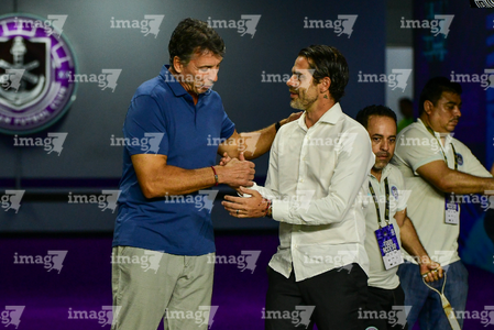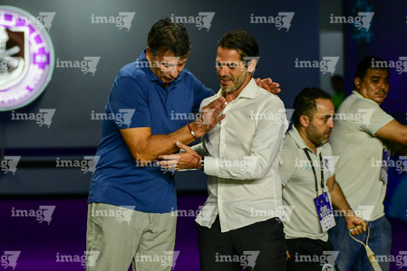 Mazatlán, Sinaloa, 7 de noviembre de 2025. Robert Dante Siboldi, director técnico y Fernando Gago, director técnico, durante el partido correspondiente a la jornada 17 del torneo Apertura 2025 de la Liga BBVA MX, entre los Cañoneros del Mazatlán FC y los Rayos del Necaxa, realizado en el estadio El Encanto. Foto: Imago7/ Sandra Bautista