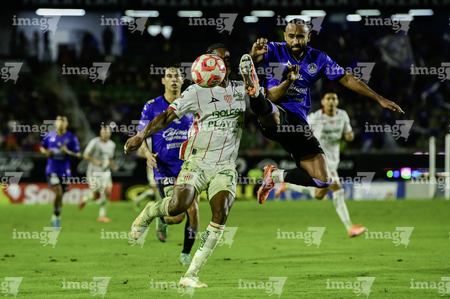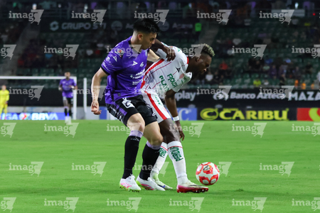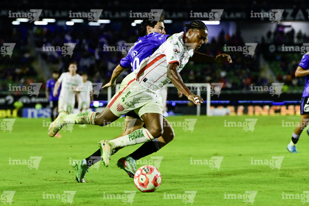 Mazatlán, Sinaloa, 7 de noviembre de 2025. Kevin Ante y Jordan Sierra, durante el partido correspondiente a la jornada 17 del torneo Apertura 2025 de la Liga BBVA MX, entre los Cañoneros del Mazatlán FC y los Rayos del Necaxa, realizado en el estadio El Encanto. Foto: Imago7/ Sandra Bautista