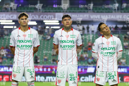Mazatlán, Sinaloa, 7 de noviembre de 2025. Tomás Jacob, Emilio Lara y José Iván Rodríguez, durante el partido correspondiente a la jornada 17 del torneo Apertura 2025 de la Liga BBVA MX, entre los Cañoneros del Mazatlán FC y los Rayos del Necaxa, realizado en el estadio El Encanto. Foto: Imago7/ Rogelio Dávila