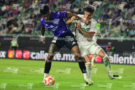 Mazatlán, Sinaloa, 7 de noviembre de 2025. Bryan Colula y Cristian Calderón "Chicote", durante el partido correspondiente a la jornada 17 del torneo Apertura 2025 de la Liga BBVA MX, entre los Cañoneros del Mazatlán FC y los Rayos del Necaxa, realizado en el estadio El Encanto. Foto: Imago7/ Rogelio Dávila
