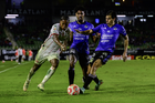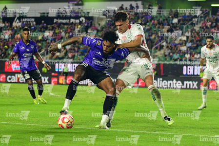Mazatlán, Sinaloa, 7 de noviembre de 2025. Kevin Ante y Mauro Zaleta, durante el partido correspondiente a la jornada 17 del torneo Apertura 2025 de la Liga BBVA MX, entre los Cañoneros del Mazatlán FC y los Rayos del Necaxa, realizado en el estadio El Encanto. Foto: Imago7/ Rogelio Dávila