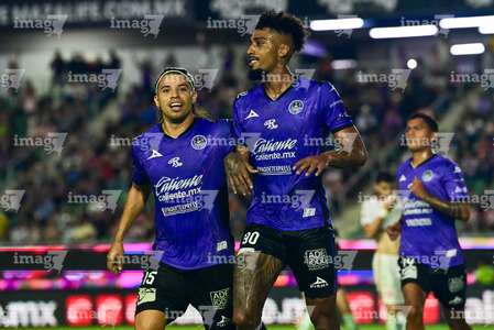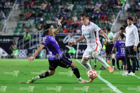Mazatlán, Sinaloa, 7 de noviembre de 2025. Fabio Gomes y Tomás Jacob, durante el partido correspondiente a la jornada 17 del torneo Apertura 2025 de la Liga BBVA MX, entre los Cañoneros del Mazatlán FC y los Rayos del Necaxa, realizado en el estadio El Encanto. Foto: Imago7/ Sandra Bautista