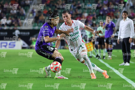 Mazatlán, Sinaloa, 7 de noviembre de 2025. Bryan Colula y Franco Rossano, durante el partido correspondiente a la jornada 17 del torneo Apertura 2025 de la Liga BBVA MX, entre los Cañoneros del Mazatlán FC y los Rayos del Necaxa, realizado en el estadio El Encanto. Foto: Imago7/ Rogelio Dávila