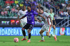 Mazatlán, Sinaloa, 7 de noviembre de 2025. Facundo Almada y Diber Cambindo, durante el partido correspondiente a la jornada 17 del torneo Apertura 2025 de la Liga BBVA MX, entre los Cañoneros del Mazatlán FC y los Rayos del Necaxa, realizado en el estadio El Encanto. Foto: Imago7/ Rogelio Dávila