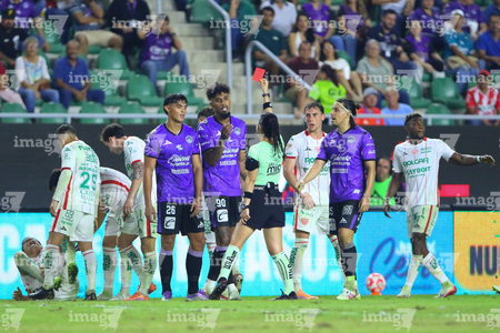 Mazatlán, Sinaloa, 7 de noviembre de 2025. Katia Itzel García, árbitra central, muestra tarjeta roja de expulsión, durante el partido correspondiente a la jornada 17 del torneo Apertura 2025 de la Liga BBVA MX, entre los Cañoneros del Mazatlán FC y los Rayos del Necaxa, realizado en el estadio El Encanto. Foto: Imago7/ Rogelio Dávila