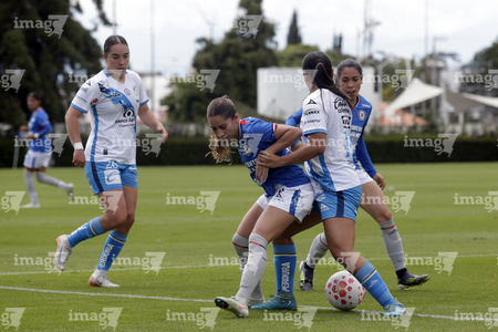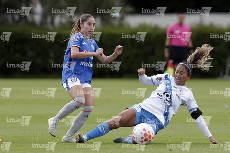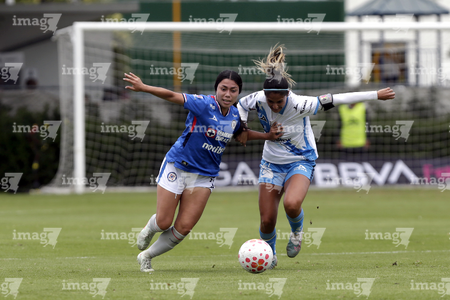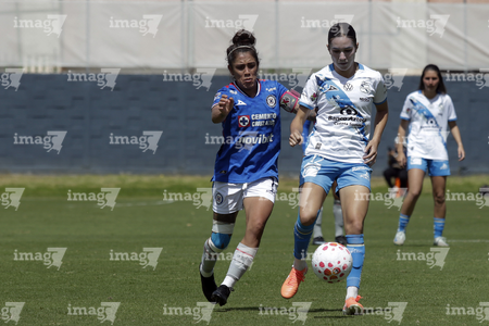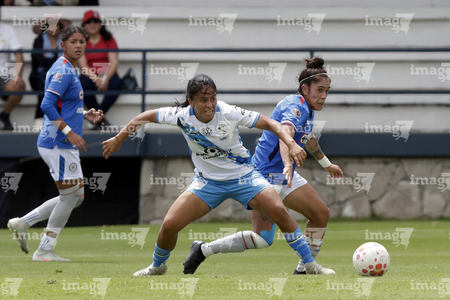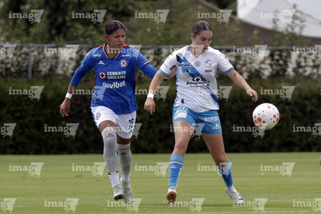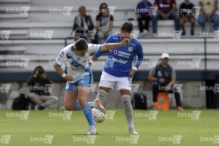 Puebla, Puebla, 21 de septiembre de 2025. Niomi Grimaldo y Rubí Villegas, durante el partido correspondiente a la jornada 12 del torneo Apertura 2025 de la Liga BBVA MX Femenil, entre el Club Puebla y la Máquina Celeste del Cruz Azul, realizado en el Club Alpha. Foto: Imago7/Mireya Novo