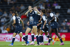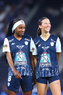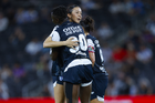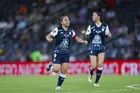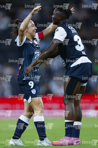 Monterrey, Nuevo León, 22 de septiembre de 2025. Nina Nicosia y Chinwendu Ihezuo en festejo, durante el partido correspondiente a la jornada 12 del torneo Apertura 2025 de la Liga BBVA MX Femenil, entre los Rayados del Monterrey y los Tuzos del Pachuca, realizado en el estadio BBVA. Foto: Imago7/