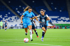 Monterrey, Nuevo León, 22 de septiembre de 2025. Charlyn Corral y Fabiola Ibarra, durante el partido correspondiente a la jornada 12 del torneo Apertura 2025 de la Liga BBVA MX Femenil, entre los Rayados del Monterrey y los Tuzos del Pachuca, realizado en el estadio BBVA. Foto: Imago7/ Nora Guerrero