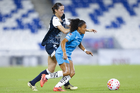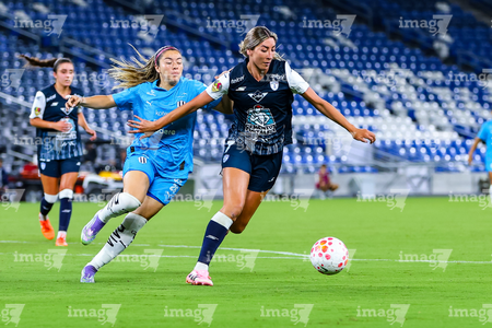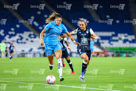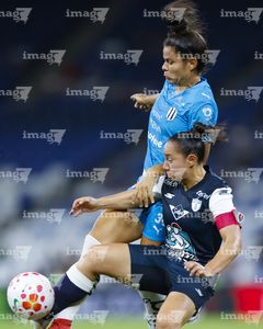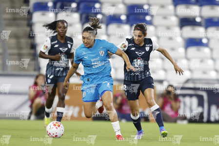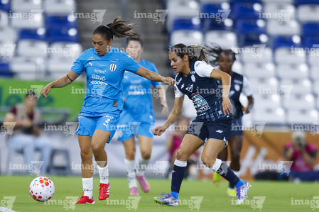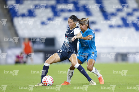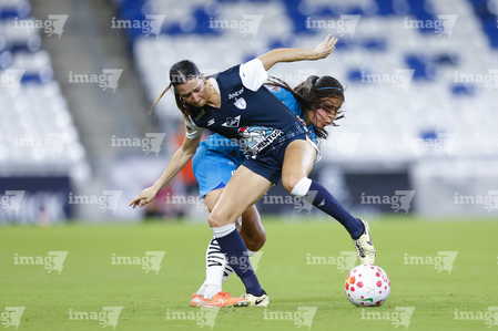 Monterrey, Nuevo León, 22 de septiembre de 2025. Katty Martínez y Jocelyn Orejel, durante el partido correspondiente a la jornada 12 del torneo Apertura 2025 de la Liga BBVA MX Femenil, entre los Rayados del Monterrey y los Tuzos del Pachuca, realizado en el estadio BBVA. Foto: Imago7/ Nora Guerrero
