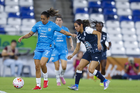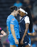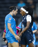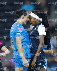 Monterrey, Nuevo León, 22 de septiembre de 2025. Emily Gielnik y Yirleidis Quejada en conato de bronca, durante el partido correspondiente a la jornada 12 del torneo Apertura 2025 de la Liga BBVA MX Femenil, entre los Rayados del Monterrey y los Tuzos del Pachuca, realizado en el estadio BBVA. Foto: Imago7/