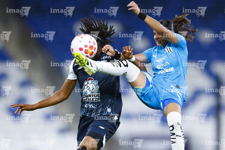 Monterrey, Nuevo León, 22 de septiembre de 2025. Yirleidis Quejada y Nina Nicosia, durante el partido correspondiente a la jornada 12 del torneo Apertura 2025 de la Liga BBVA MX Femenil, entre los Rayados del Monterrey y los Tuzos del Pachuca, realizado en el estadio BBVA. Foto: Imago7/David Arzamendi