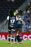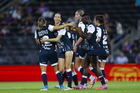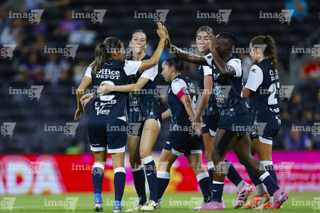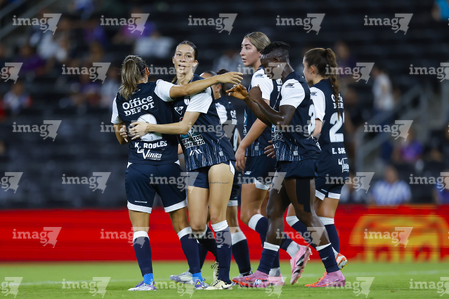 Monterrey, Nuevo León, 22 de septiembre de 2025. Jugadoras de Tuzas en festejo de gol, durante el partido correspondiente a la jornada 12 del torneo Apertura 2025 de la Liga BBVA MX Femenil, entre los Rayados del Monterrey y los Tuzos del Pachuca, realizado en el estadio BBVA. Foto: Imago7/