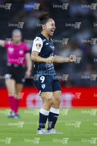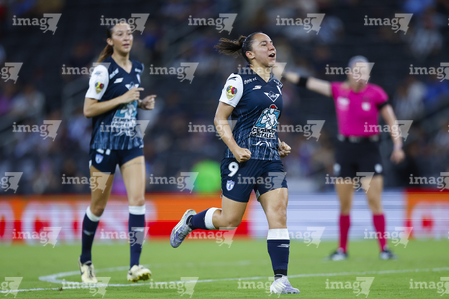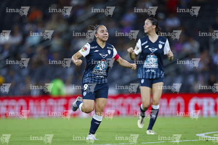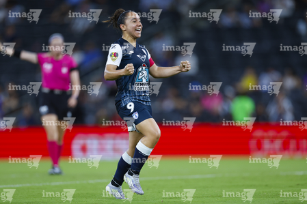 Monterrey, Nuevo León, 22 de septiembre de 2025. Charlyn Corral en festejo de gol durante el partido correspondiente a la jornada 12 del torneo Apertura 2025 de la Liga BBVA MX Femenil, entre los Rayados del Monterrey y los Tuzos del Pachuca, realizado en el estadio BBVA. Foto: Imago7/