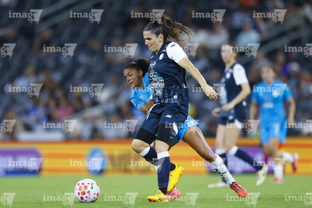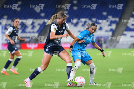 Monterrey, Nuevo León, 22 de septiembre de 2025. Esthefanny Barreras y Christina Burkenroad, durante el partido correspondiente a la jornada 12 del torneo Apertura 2025 de la Liga BBVA MX Femenil, entre los Rayados del Monterrey y los Tuzos del Pachuca, realizado en el estadio BBVA. Foto: Imago7/David Arzamendi