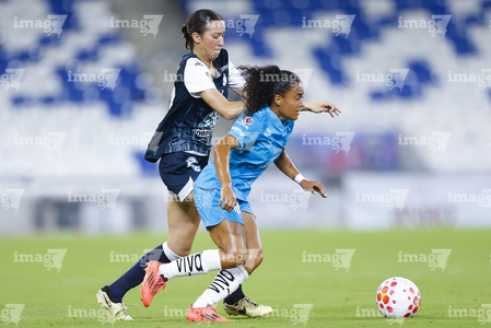Monterrey, Nuevo León, 22 de septiembre de 2025. Day Silva y Charlyn Corral, durante el partido correspondiente a la jornada 12 del torneo Apertura 2025 de la Liga BBVA MX Femenil, entre los Rayados del Monterrey y los Tuzos del Pachuca, realizado en el estadio BBVA. Foto: Imago7/