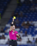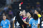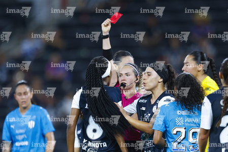 Monterrey, Nuevo León, 22 de septiembre de 2025. Ximena Márquez Ruiz, árbitra central muestra tarjeta roja de expulsión a Yirleidis Quejada, durante el partido correspondiente a la jornada 12 del torneo Apertura 2025 de la Liga BBVA MX Femenil, entre los Rayados del Monterrey y los Tuzos del Pachuca, realizado en el estadio BBVA. Foto: Imago7/