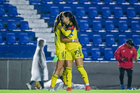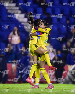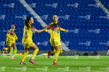 Ciudad de México, 26 de septiembre de 2025. Montserrat Saldivar y Scarlett Camberos en festejo de gol, durante el partido correspondiente a la jornada 13 del torneo Apertura 2025 de la Liga BBVA MX Femenil, entre las Águilas del América y las Bravas de Juárez, realizado en el Estadio Ciudad de los Deportes. Foto: Imago7/ Mauricio Ruiz