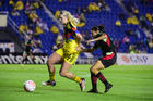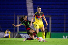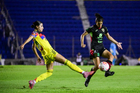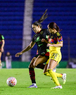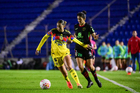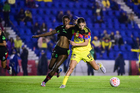 Ciudad de México, 26 de septiembre de 2025. Julitha Singano y Scarlett Camberos, durante el partido correspondiente a la jornada 13 del torneo Apertura 2025 de la Liga BBVA MX Femenil, entre las Águilas del América y las Bravas de Juárez, realizado en el Estadio Ciudad de los Deportes. Foto: Imago7/ Mauricio Ruiz