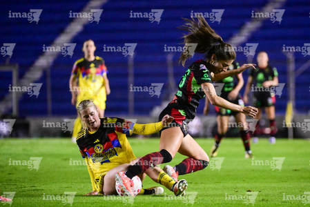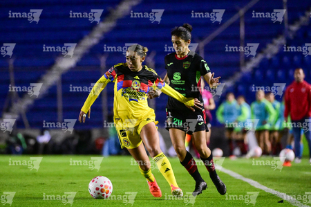 Ciudad de México, 26 de septiembre de 2025. Miah Zuazua y Itzel Velasco, durante el partido correspondiente a la jornada 13 del torneo Apertura 2025 de la Liga BBVA MX Femenil, entre las Águilas del América y las Bravas de Juárez, realizado en el Estadio Ciudad de los Deportes. Foto: Imago7/ Mauricio Ruiz
