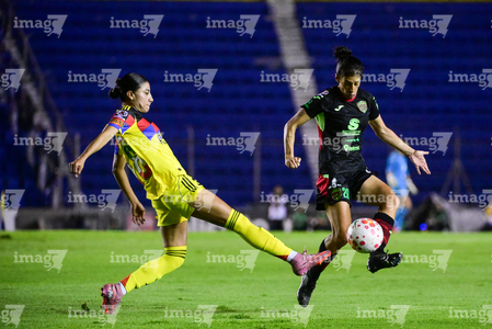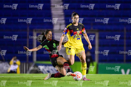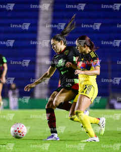 Ciudad de México, 26 de septiembre de 2025. Yunaira Lopez y Montserrat Saldivar, durante el partido correspondiente a la jornada 13 del torneo Apertura 2025 de la Liga BBVA MX, entre las Águilas del América y las Bravas de FC Juárez, realizado en el estadio Ciudad de los Deportes. Foto: Imago7/ Alexis Chavez