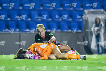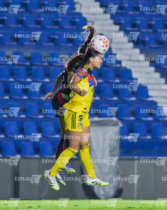 Ciudad de México, 26 de septiembre de 2025. Norma Palafox y Jana Gutiérrez, durante el partido correspondiente a la jornada 13 del torneo Apertura 2025 de la Liga BBVA MX, entre las Águilas del América y las Bravas de FC Juárez, realizado en el estadio Ciudad de los Deportes. Foto: Imago7/ Alexis Chavez