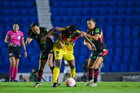 Ciudad de México, 26 de septiembre de 2025. Nancy Antonio, Liliana Mercado y Scarlett Camberos, durante el partido correspondiente a la jornada 13 del torneo Apertura 2025 de la Liga BBVA MX, entre las Águilas del América y las Bravas de FC Juárez, realizado en el estadio Ciudad de los Deportes. Foto: Imago7/ Alexis Chavez