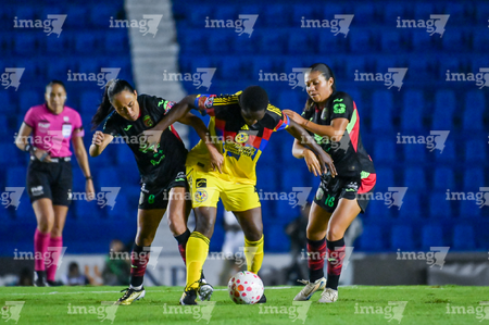Ciudad de México, 26 de septiembre de 2025. Liliana Mercado, Chidinma Okeke y Giselle Espinoza, durante el partido correspondiente a la jornada 13 del torneo Apertura 2025 de la Liga BBVA MX Femenil, entre las Águilas del América y las Bravas de Juárez, realizado en el Estadio Ciudad de los Deportes. Foto: Imago7/ Mauricio Ruiz