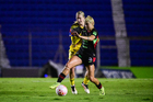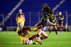 Ciudad de México, 26 de septiembre de 2025. Jana Gutiérrez y Norma Palafox, durante el partido correspondiente a la jornada 13 del torneo Apertura 2025 de la Liga BBVA MX Femenil, entre las Águilas del América y las Bravas de Juárez, realizado en el Estadio Ciudad de los Deportes. Foto: Imago7/ Mauricio Ruiz