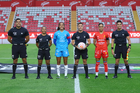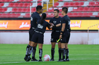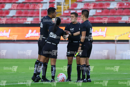 Aguascalientes, Aguascalientes, 29 de septiembre de 2025. Árbitros, durante el partido correspondiente a la jornada 13 del torneo Apertura 2025 de la Liga BBVA MX, entre las Centellas del Necaxa y las Rayadas del Monterrey, realizado en el estadio Victoria. Foto: Imago7/ Rogelio Davila