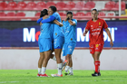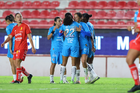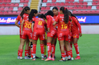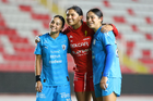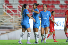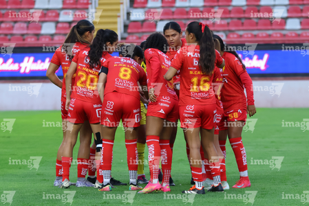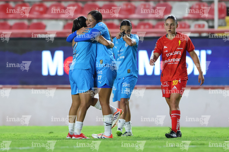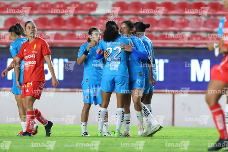 Aguascalientes, Aguascalientes, 29 de septiembre de 2025. Jugadoras del Necaxa, durante el partido correspondiente a la jornada 13 del torneo Apertura 2025 de la Liga BBVA MX, entre las Centellas del Necaxa y las Rayadas del Monterrey, realizado en el estadio Victoria. Foto: Imago7/ Rogelio Davila