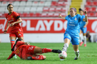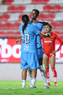 Aguascalientes, Aguascalientes, 29 de septiembre de 2025. Alice Soto y Jermaine Seoposenwe en festejo de gol, durante el partido correspondiente a la jornada 13 del torneo Apertura 2025 de la Liga BBVA MX, entre las Centellas del Necaxa y las Rayadas del Monterrey, realizado en el estadio Victoria. Foto: Imago7/ Rogelio Davila