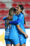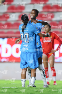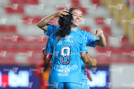 Aguascalientes, Aguascalientes, 29 de septiembre de 2025. Katty Martínez y Fátima Servin en festejo de gol, durante el partido correspondiente a la jornada 13 del torneo Apertura 2025 de la Liga BBVA MX, entre las Centellas del Necaxa y las Rayadas del Monterrey, realizado en el estadio Victoria. Foto: Imago7/ Rogelio Davila