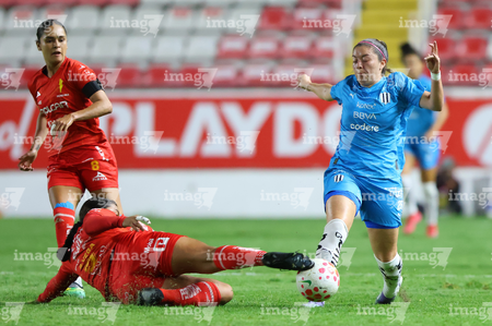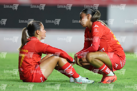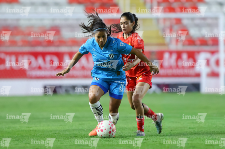 Aguascalientes, Aguascalientes, 29 de septiembre de 2025. Alejandra Lua y Ahtziri Méndez, durante el partido correspondiente a la jornada 13 del torneo Apertura 2025 de la Liga BBVA MX, entre las Centellas del Necaxa y las Rayadas del Monterrey, realizado en el estadio Victoria. Foto: Imago7/ Rogelio Davila