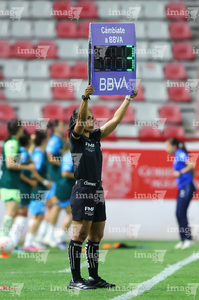 Aguascalientes, Aguascalientes, 29 de septiembre de 2025. Cesia Deysire Campos, cuarta árbitra con el tablero electrónico de cambios, durante el partido correspondiente a la jornada 13 del torneo Apertura 2025 de la Liga BBVA MX, entre las Centellas del Necaxa y las Rayadas del Monterrey, realizado en el estadio Victoria. Foto: Imago7/ Rogelio Davila