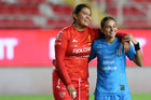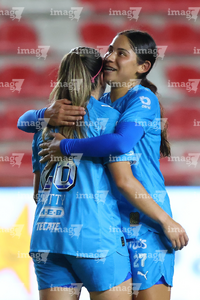 Aguascalientes, Aguascalientes, 29 de septiembre de 2025. Katty Martínez y Nicole Pérez en festejo de gol, durante el partido correspondiente a la jornada 13 del torneo Apertura 2025 de la Liga BBVA MX, entre las Centellas del Necaxa y las Rayadas del Monterrey, realizado en el estadio Victoria. Foto: Imago7/ Rogelio Davila