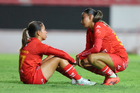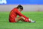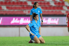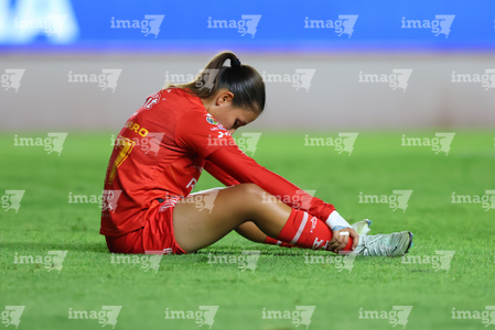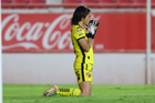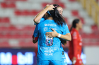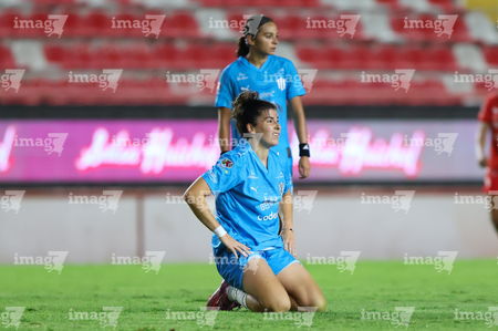 Aguascalientes, Aguascalientes, 29 de septiembre de 2025. Avril Navarro en lamento, durante el partido correspondiente a la jornada 13 del torneo Apertura 2025 de la Liga BBVA MX, entre las Centellas del Necaxa y las Rayadas del Monterrey, realizado en el estadio Victoria. Foto: Imago7/ Rogelio Davila