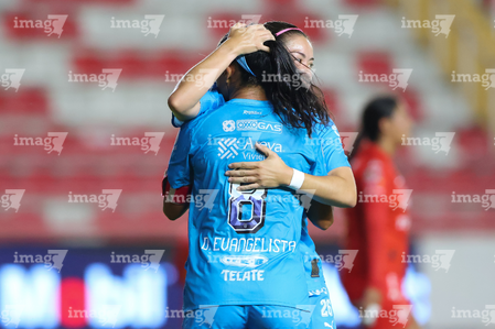Aguascalientes, Aguascalientes, 29 de septiembre de 2025. Diana Evangelista y Katty Martínez en festejo de gol, durante el partido correspondiente a la jornada 13 del torneo Apertura 2025 de la Liga BBVA MX, entre las Centellas del Necaxa y las Rayadas del Monterrey, realizado en el estadio Victoria. Foto: Imago7/ Rogelio Davila