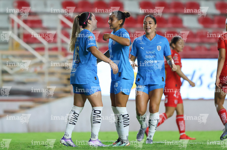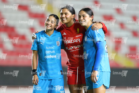 Aguascalientes, Aguascalientes, 29 de septiembre de 2025. Alice Soto, Brenda Vega y Fátima Servin, durante el partido correspondiente a la jornada 13 del torneo Apertura 2025 de la Liga BBVA MX, entre las Centellas del Necaxa y las Rayadas del Monterrey, realizado en el estadio Victoria. Foto: Imago7/ Rogelio Davila