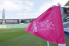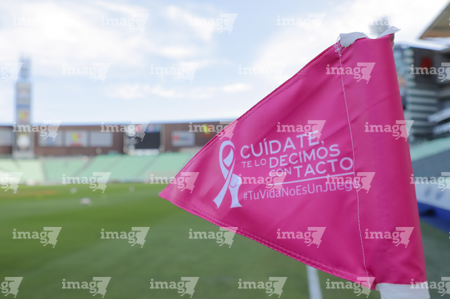 Torreón, Coahuila, 6 de octubre de 2025. Banderin de tiro de esquina de la Campaña Rosa para la concientización del Cáncer de Mama, durante el partido correspondiente a la jornada 14 del torneo Apertura 2025 de la Liga BBVA MX Femenil, entre las Guerreras de Santos Laguna y las Bravas de FC Juárez, realizado en el estadio Corona. Foto: Imago7/ Saul Perales