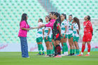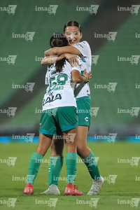Torreón, Coahuila, 6 de octubre de 2025. Jugadoras de Santos femenil, durante el partido correspondiente a la jornada 14 del torneo Apertura 2025 de la Liga BBVA MX Femenil, entre las Guerreras de Santos Laguna y las Bravas de FC Juárez, realizado en el estadio Corona. Foto: Imago7/ Saul Perales