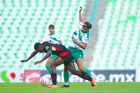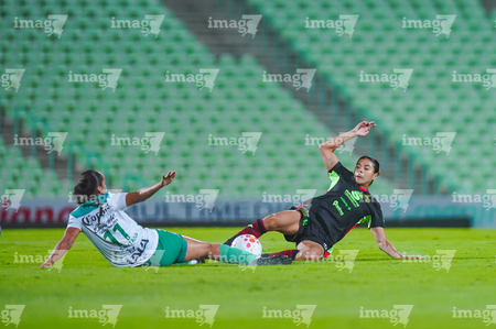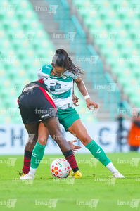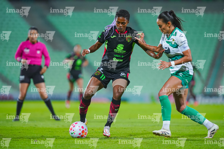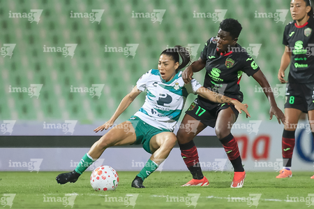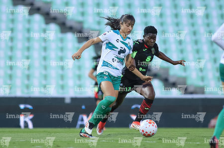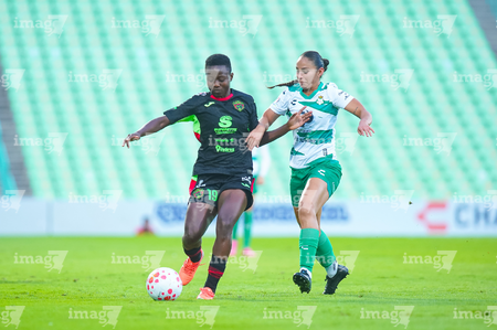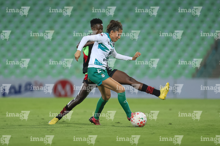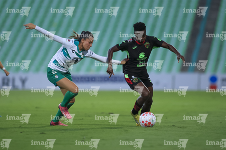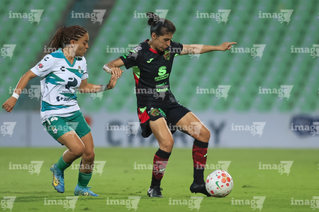Torreón, Coahuila, 6 de octubre de 2025. Enekia Lunyamila y Alexa Hernández, durante el partido correspondiente a la jornada 14 del torneo Apertura 2025 de la Liga BBVA MX Femenil, entre las Guerreras de Santos Laguna y las Bravas de FC Juárez, realizado en el estadio Corona. Foto: Imago7/ Saul Perales