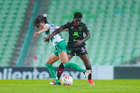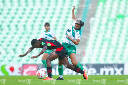 Torreón, Coahuila, 6 de octubre de 2025. Lia Romero y Grace Asantewaa, durante el partido correspondiente a la jornada 14 del torneo Apertura 2025 de la Liga BBVA MX Femenil, entre las Guerreras de Santos Laguna y las Bravas de FC Juárez, realizado en el estadio Corona. Foto: Imago7/ Saul Perales