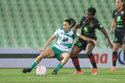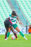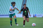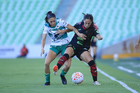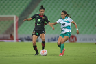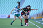 Torreón, Coahuila, 6 de octubre de 2025. Doménica Rodríguez y Karime Abud, durante el partido correspondiente a la jornada 14 del torneo Apertura 2025 de la Liga BBVA MX Femenil, entre las Guerreras de Santos Laguna y las Bravas de FC Juárez, realizado en el estadio Corona. Foto: Imago7/ Saul Perales