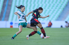 Torreón, Coahuila, 6 de octubre de 2025. Yessenia Novella y Eva González, durante el partido correspondiente a la jornada 14 del torneo Apertura 2025 de la Liga BBVA MX Femenil, entre las Guerreras de Santos Laguna y las Bravas de FC Juárez, realizado en el estadio Corona. Foto: Imago7/ Saul Perales