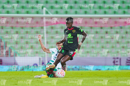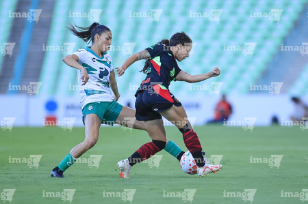 Torreón, Coahuila, 6 de octubre de 2025. Alexa Hernández y Grace Asantewaa, durante el partido correspondiente a la jornada 14 del torneo Apertura 2025 de la Liga BBVA MX Femenil, entre las Guerreras de Santos Laguna y las Bravas de FC Juárez, realizado en el estadio Corona. Foto: Imago7/ Saul Perales