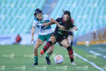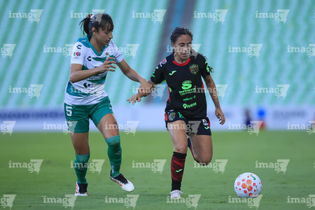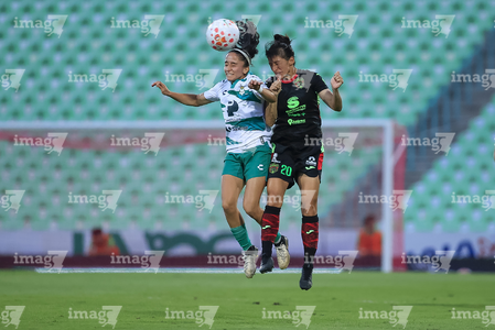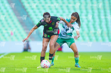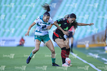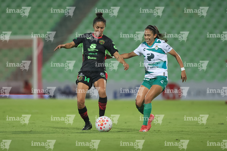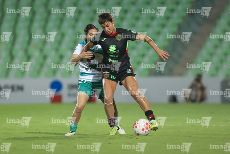 Torreón, Coahuila, 6 de octubre de 2025. Lia Romero y Eva González, durante el partido correspondiente a la jornada 14 del torneo Apertura 2025 de la Liga BBVA MX Femenil, entre las Guerreras de Santos Laguna y las Bravas de FC Juárez, realizado en el estadio Corona. Foto: Imago7/ Saul Perales