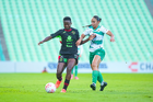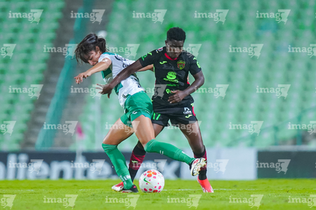 Torreón, Coahuila, 6 de octubre de 2025. Yessenia Novella y Grace Asantewaa, durante el partido correspondiente a la jornada 14 del torneo Apertura 2025 de la Liga BBVA MX Femenil, entre las Guerreras de Santos Laguna y las Bravas de FC Juárez, realizado en el estadio Corona. Foto: Imago7/ Erick Saavedra