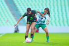 Torreón, Coahuila, 6 de octubre de 2025. Dayana Martin y María Peraza, durante el partido correspondiente a la jornada 14 del torneo Apertura 2025 de la Liga BBVA MX Femenil, entre las Guerreras de Santos Laguna y las Bravas de FC Juárez, realizado en el estadio Corona. Foto: Imago7/ Erick Saavedra