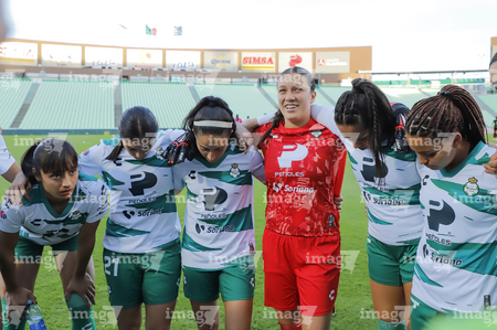 Torreón, Coahuila, 6 de octubre de 2025. Foto de equipo de Santos, durante el partido correspondiente a la jornada 14 del torneo Apertura 2025 de la Liga BBVA MX Femenil, entre las Guerreras de Santos Laguna y las Bravas de FC Juárez, realizado en el estadio Corona. Foto: Imago7/ Saul Perales