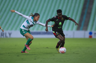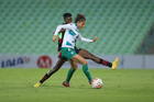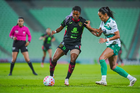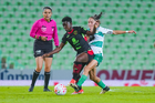 Torreón, Coahuila, 6 de octubre de 2025. Julitha Singano y Mayra Santana, durante el partido correspondiente a la jornada 14 del torneo Apertura 2025 de la Liga BBVA MX Femenil, entre las Guerreras de Santos Laguna y las Bravas de FC Juárez, realizado en el estadio Corona. Foto: Imago7/ Erick Saavedra